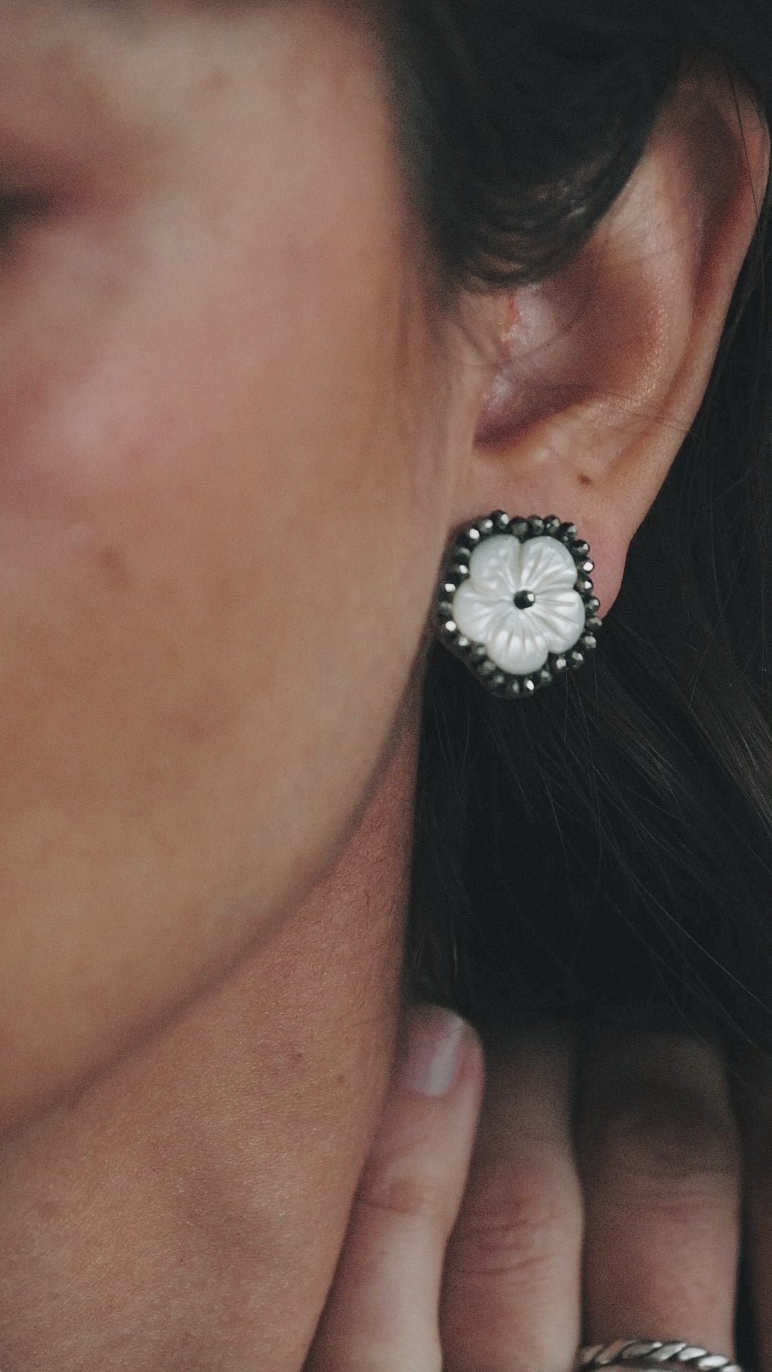 Descubre la elegancia única de los Aros Alphecca, bordados a mano por Ignacia Castillo. Cada par combina la delicadeza de la flor de nácar con el brillo de cristales facetados, con vástago y tope de aro bañados en oro. Perfectos para quienes buscan un toque sofisticado y artesanal que destaque en cualquier ocasión.