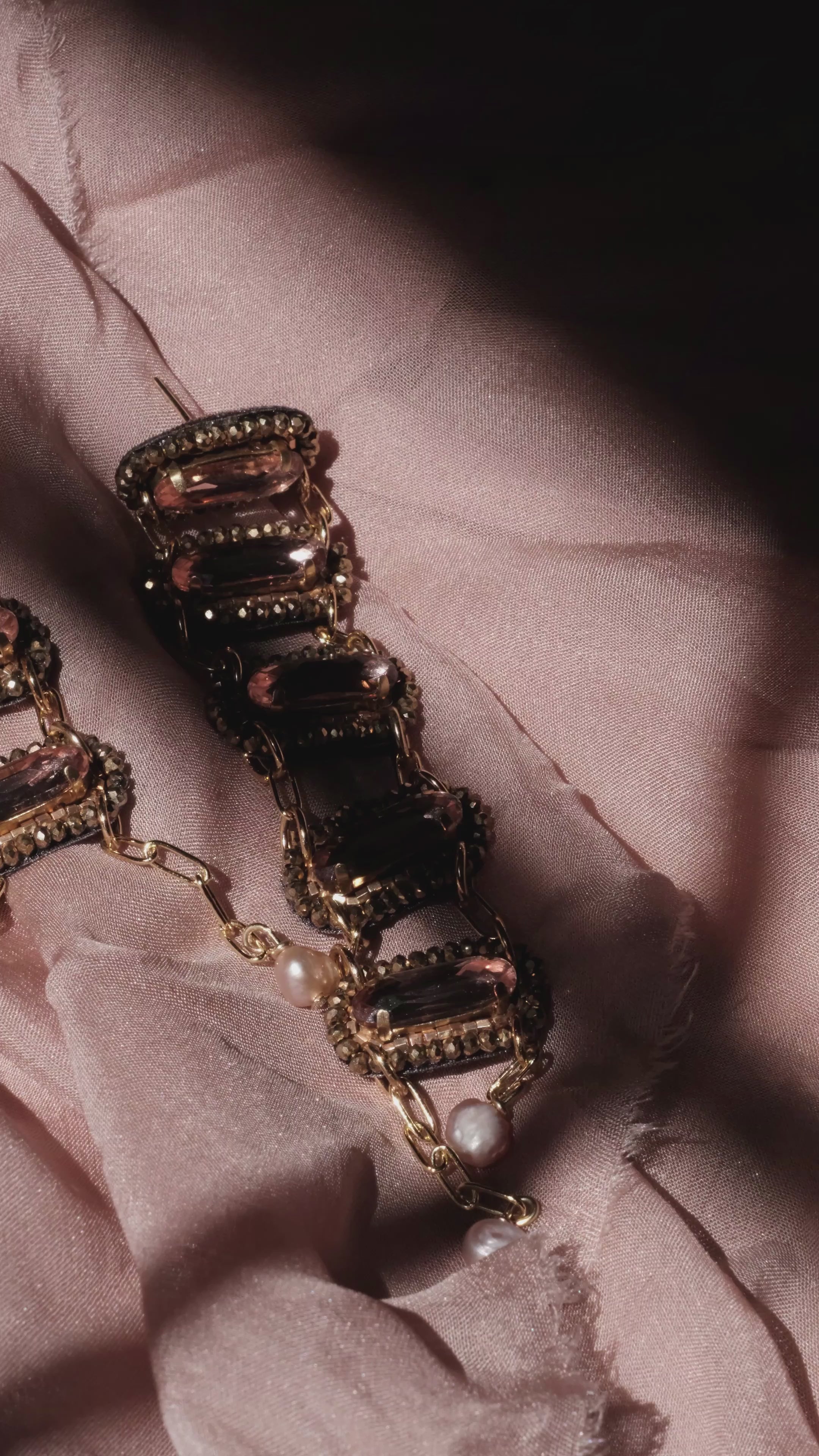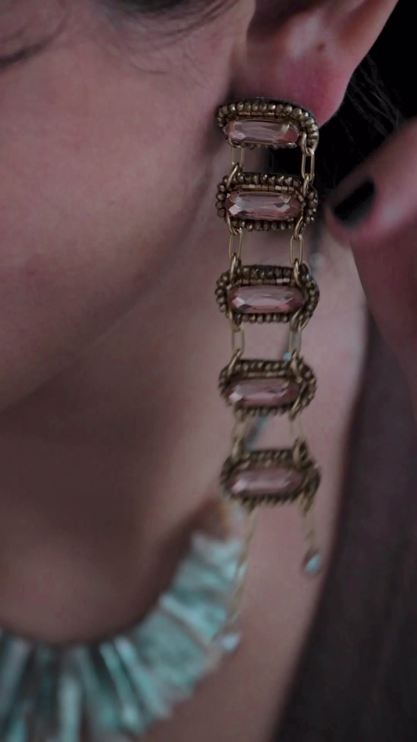 Explora la elegancia y el lujo con los aros bordados a mano por Ignacia Castillo, diseñados con 5 piezas bordadas unidas por cadenas y argollas bañadas en oro y con terminación en punta de finas perlas naturales color rosa. Hechos especialmente para ti bajo pedido.